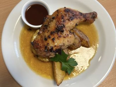 Marinovaný kuřecí steak v řeckém jogurtu a čerstvé mátě, šťouchané brambory, zelný salát s mrkví 7