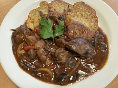 170g Vepřová líčka s omáčkou z červeného vína a brusinek, bramboráčky