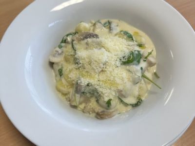 Penne s pancettou, artyčoky, baby špenát, krémová omáčka, sýr Grana Padano