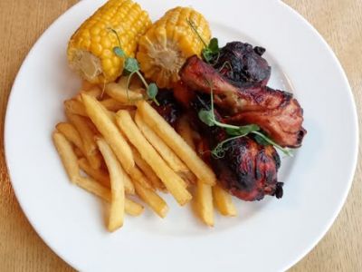 200g Sečuánská vepřová kotleta s restovanou hlívou ústřičnou, pečené fazolky s anglickou slaninou a sázené vejce