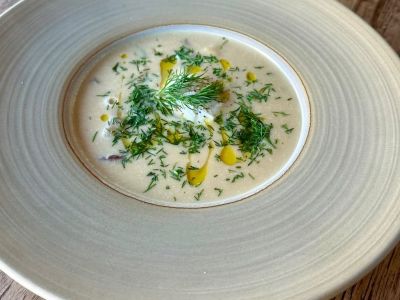 Zvýhodněné menu Kapří polévka * Hovězí kuličky, omáčka z pečených rajčat, tarhoňa, bazalkový olej * Denní dezert