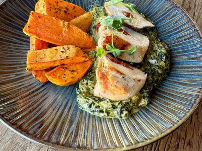 Kuřecí steak, omáčka z pečených paprik, pečené Grenaille