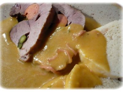 Kuřecí roláda se slaninou a špenátem, zelenina na páře, bramborová kaše