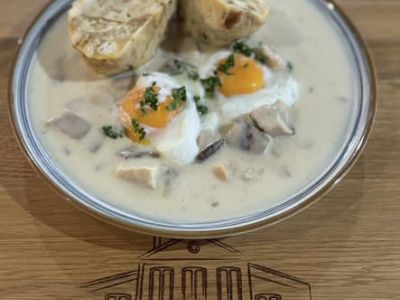 smažené pštrosí vejce, šťouchané brambory s cibulkou