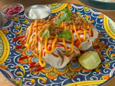 Pečený bramborák plněný zeleninou s kuřecím masem, smetanový dip
