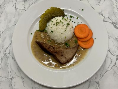 100g Hovězí pečeně zbojnická, dušená rýže (h. zadní, slanina, cibule, česnek) 1