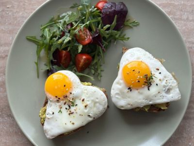 Vaječná omeleta s baby špenátem, čedar, pečivo