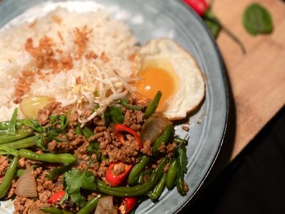 Zvěřinové ragú na víně. Pomalu dušené kousky kančí plece v silné redukci z kořenové zeleniny, divokého koření a červeného vína. Šťavnaté maso s bohatou tmavou omáčkou podáváme s nadýchanou rýží promíchanou s mladým hráškem pro svěží kontrast.