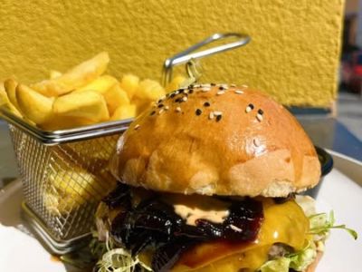 BBQ Strips Quesadilla. Křupavé kuřecí stripsy v bbq omáčce, slanina, kukuřice, rajčátka a jemný creme fraiche. To vše spojené rozpuštěným sýrem v jednu neodolatelnou chuťovou bombu. Podáváme s porcí zlatavých hranolek.