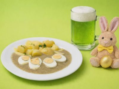 Čočka na kyselo, sázená vejce, okurek, chléb