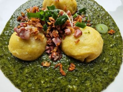 Plněné bramborové knedlíky uzeným masem, špenát (dušené zelí)