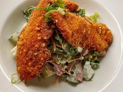 Smažené řízkové duo bramborová kaše, okurkový salát