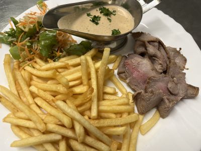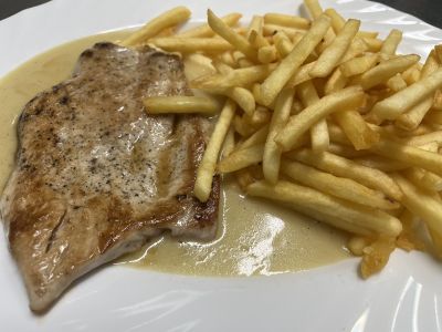 Vepřový steak se šunkou a vejcem, hranolky, tatarská omáčka / brambory / 13