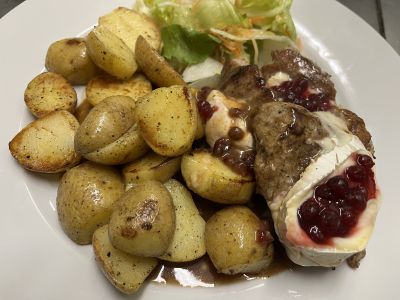Vepřový steak zapečený se šunkoua hermelínem, šťouchané brambory (1,7)
