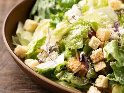 Listový salát z pečenou vepřovou panenkou, vejcem, pečeným bramborem, mayo ze sýru gorgonzola