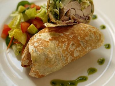 100g Kuřecí tortila, hranolky, ledový salát, kysaná smetana