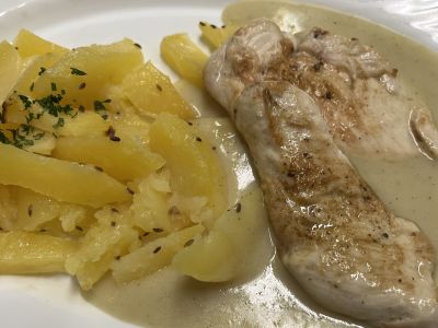 Pikantule (kuřecí prsa na nudličky, americký brambor, niva, smetana, brokolice a zapečené sýrem)