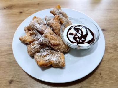 Lívanečky s ovocným přelivem sypané cukrem