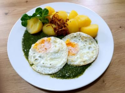 Dušený špenát, vepřový vrabec nebo sázené vejce, vařené brambory nebo bramborový knedlík