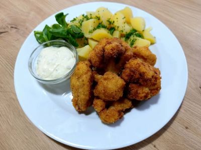 Smažený květák, vařený brambor, tatarská omáčka
