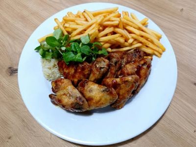 Smažený kuřecí gordon, vařené brambory/hranolky, tatarka, obloha (1, 3, 7) 137