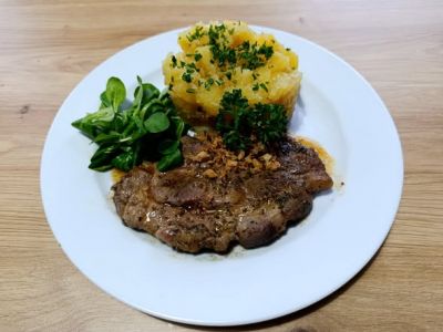 Vepřové žebírko s bylinkovým máslem, brambory z pece