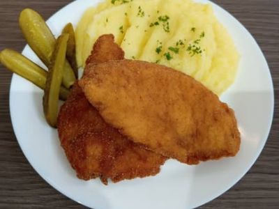 250g Kuřecí/Vepřový řízek s bram. salátem nebo kaší