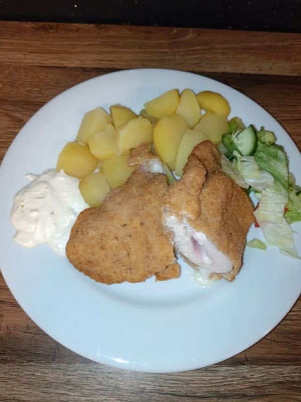 Gordon bleu, vařené brambory, tatarka 1, 3, 7, 10