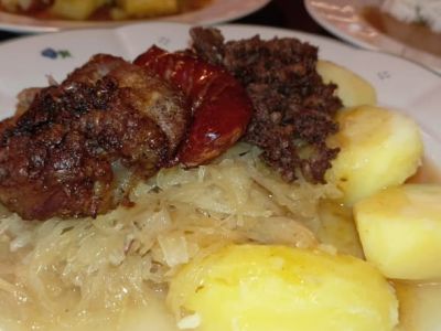 120g Opečená klobása, dušená kapusta s bramborem, chléb