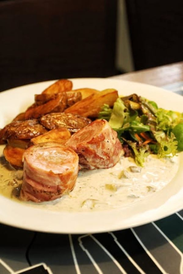 Pečené kuřecí stehno s „popelem starého dědka“ (uzený černý pepř) zdobené plátkem farmářského špeku- bezlepkové