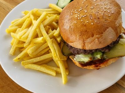 Burger s trhaným vepřovým masem, wasabi mayo, hranolky