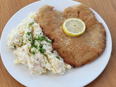 Smažený vepřový řízek v bylinkové strouhance, vídeňský bramborový salát