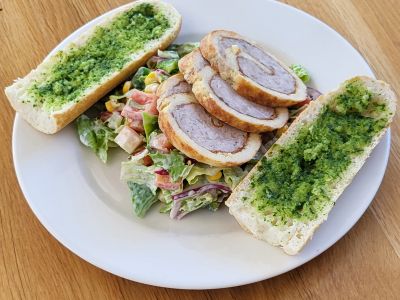 300g Grilovaná Mozzarella obalená v parmské šunce na grilu, bazalkové pesto, trhané salátové listy, čekanka, bylinková bageta 137