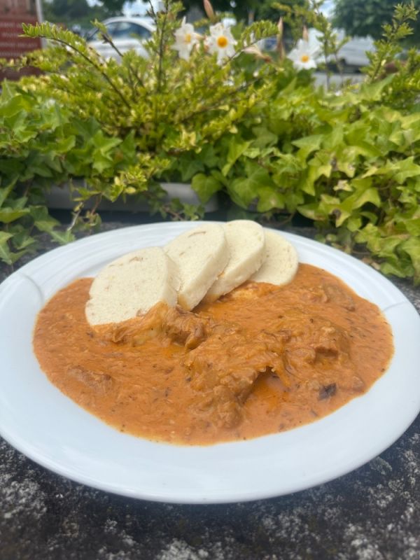 150g Hirschragout – Ragú z jelena na korenové zelenine a cerv. víne, perníkový knedlík, brusinky