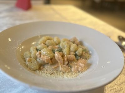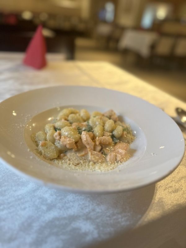 1. BRAMBOROVÉ NOKY S VEPŘOVOU PANENKOU v krémové omáčce se sýrem Gorgonzola, bazalkou a cherry rajčaty 1379