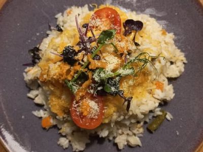 Krémové rizoto s červenou řepou a kozím sýrem.