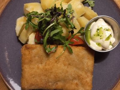 Smažená treska, bramborová kaše, citrón 1, 3, 4, 7