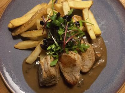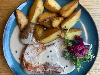 Grilovaná vepřová panenka, brusinková omáčka, pečené baby brambůrky