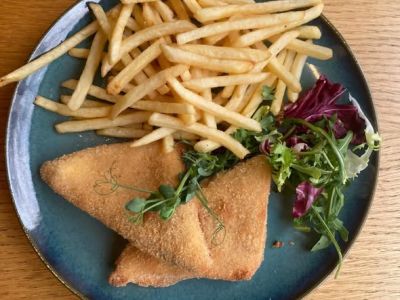 Smažený kuřecí řízek, šlehaná bramborová kaše sypaná jarní cibulkou ①③⑦