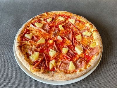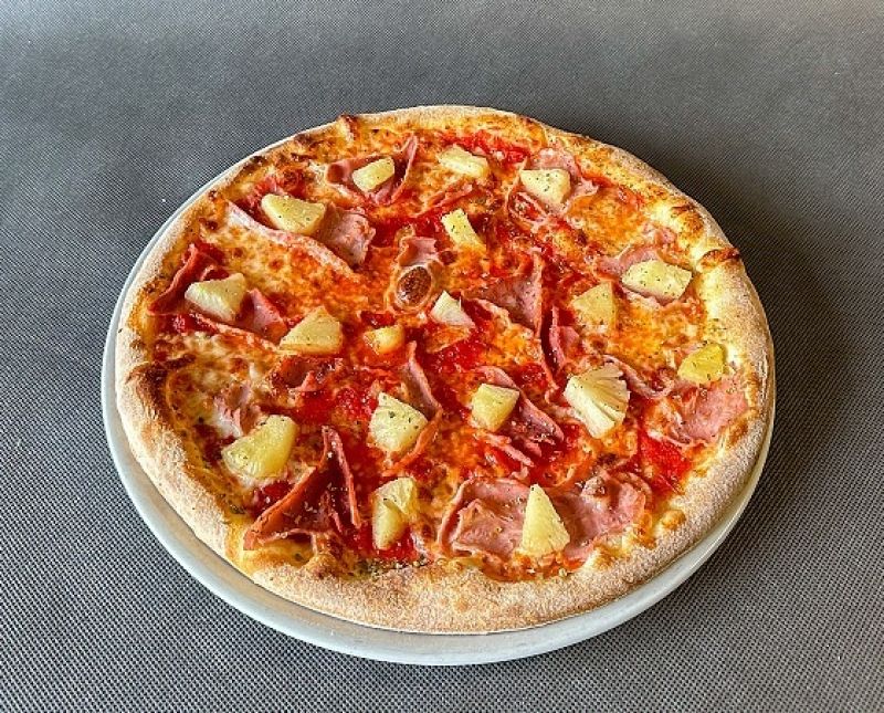 Pizza Hawaii- tomaty, mozzarella fior di latte, šunka, ananas