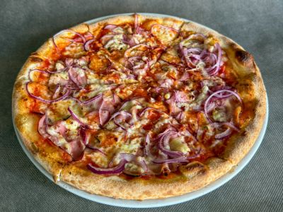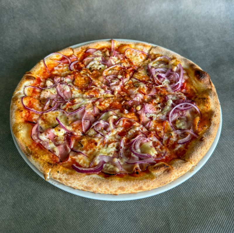 Pizza Maestro- tomaty, mozzarella fior di latte, slanina, cibule, česnek, pepperoncino, uz. sýr – LEHCE PIKANTNÍ