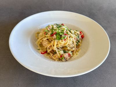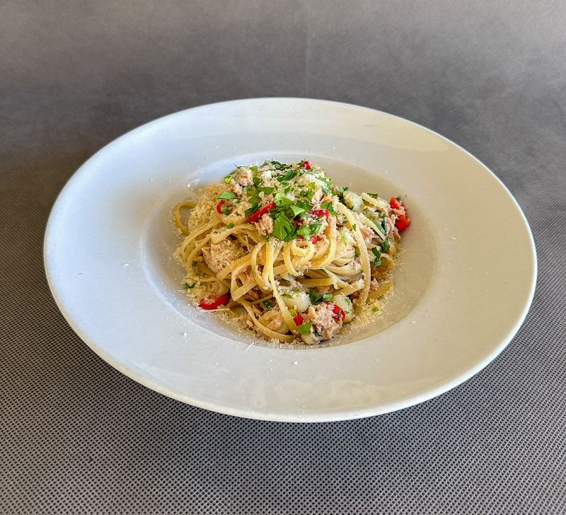 Linguine con tonno – linguine, tuňák, česnek, chilli paprička, sýr Grana PadanoLEHCE PIKANTNÍ