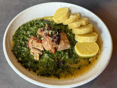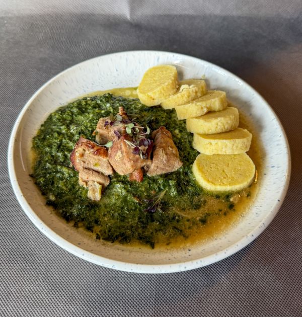 Moravský brabec – pomalu pečené vepřové maso se špenátem a domácím bramborovým knedlíkem, výpek