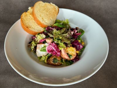 300g Zeleninový salát s grilovaným sýrem Halloumi a bylinkovým dresinkem, opečená bageta