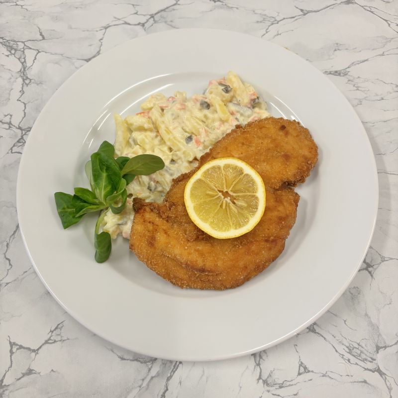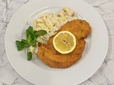 Smažený kuřecí řízek, brambory s cibulkou, sterilovaný okurek