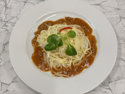 Spaghetti alla Bolognese Pomalu vařené ragú z mletého hovězího a vepřového masa, dušené s kořenovou zeleninou a rajčaty, podávané s parmazánem. Alergeny: 1, 7, 9