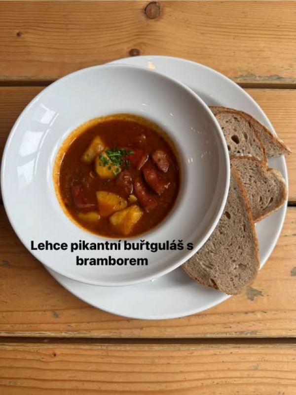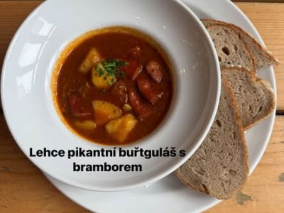 150g Buřtguláš s bramborem a cibulkou, čerstvý chléb