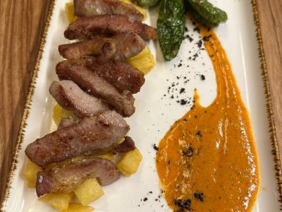 180g grilované kachní prso s brusinkovo-smetanovou omáčkou, domácí