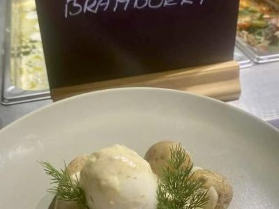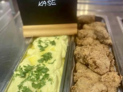 Smažené pštrosí vejce, bramborová kaše, kompot
