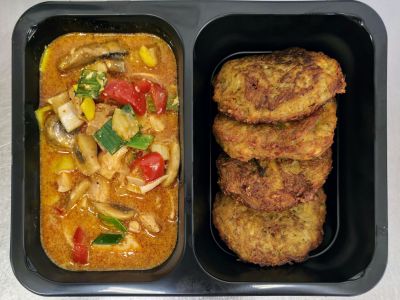 100g Kuřecí maso na indický způsob, dušená rýže (kuřecí prsa, smetana, jablka, cibule, kari) 167